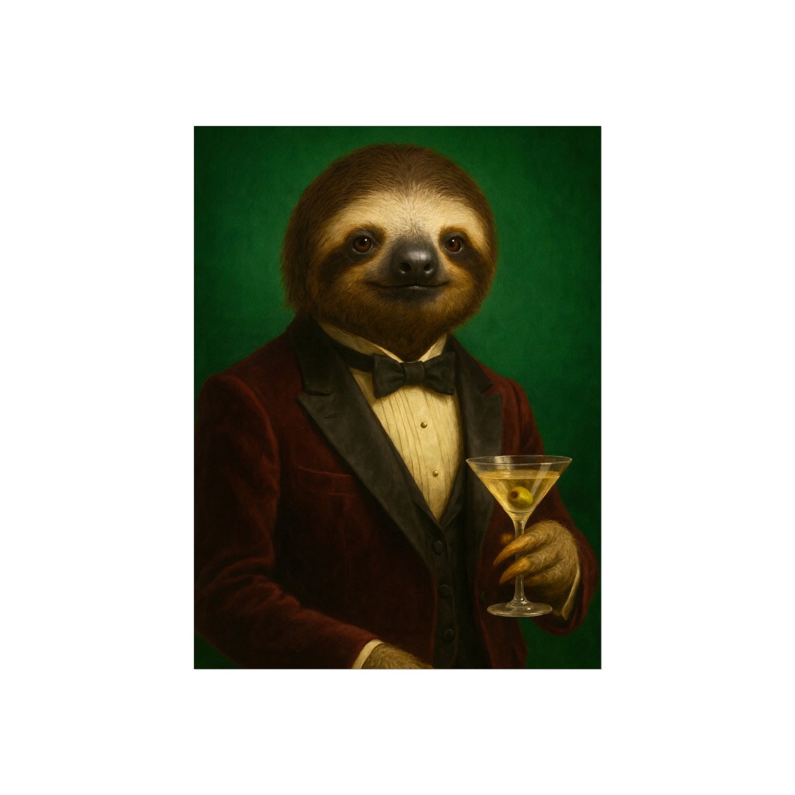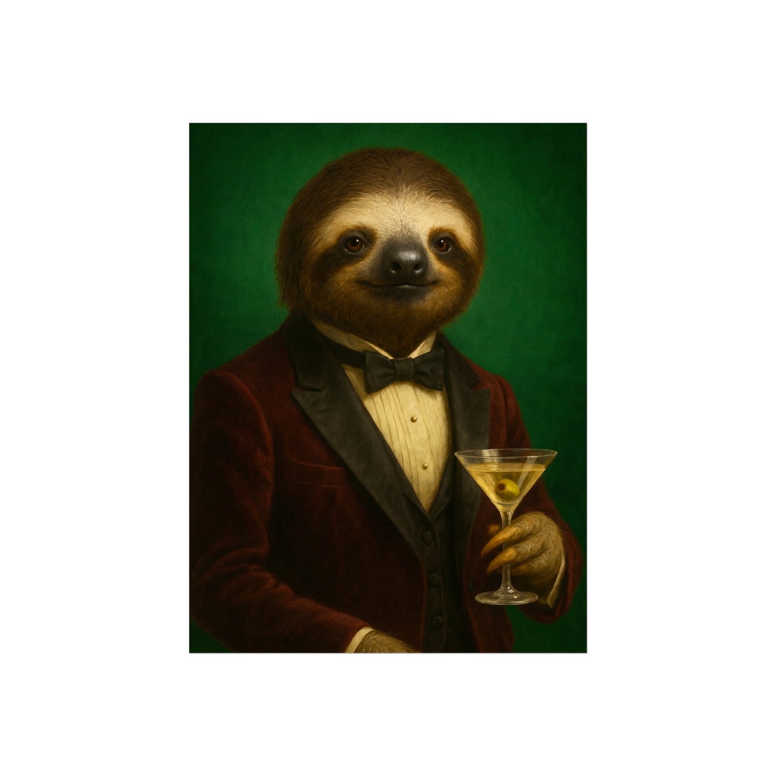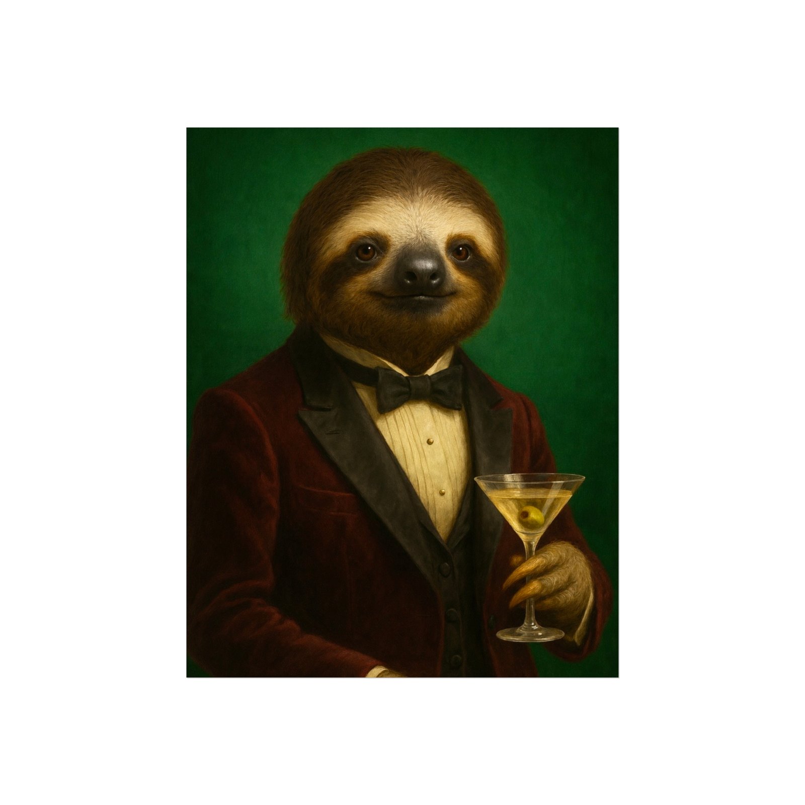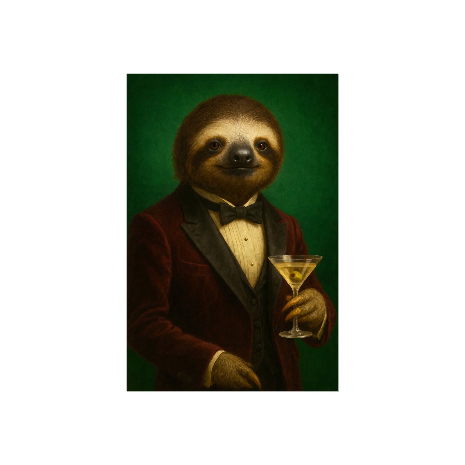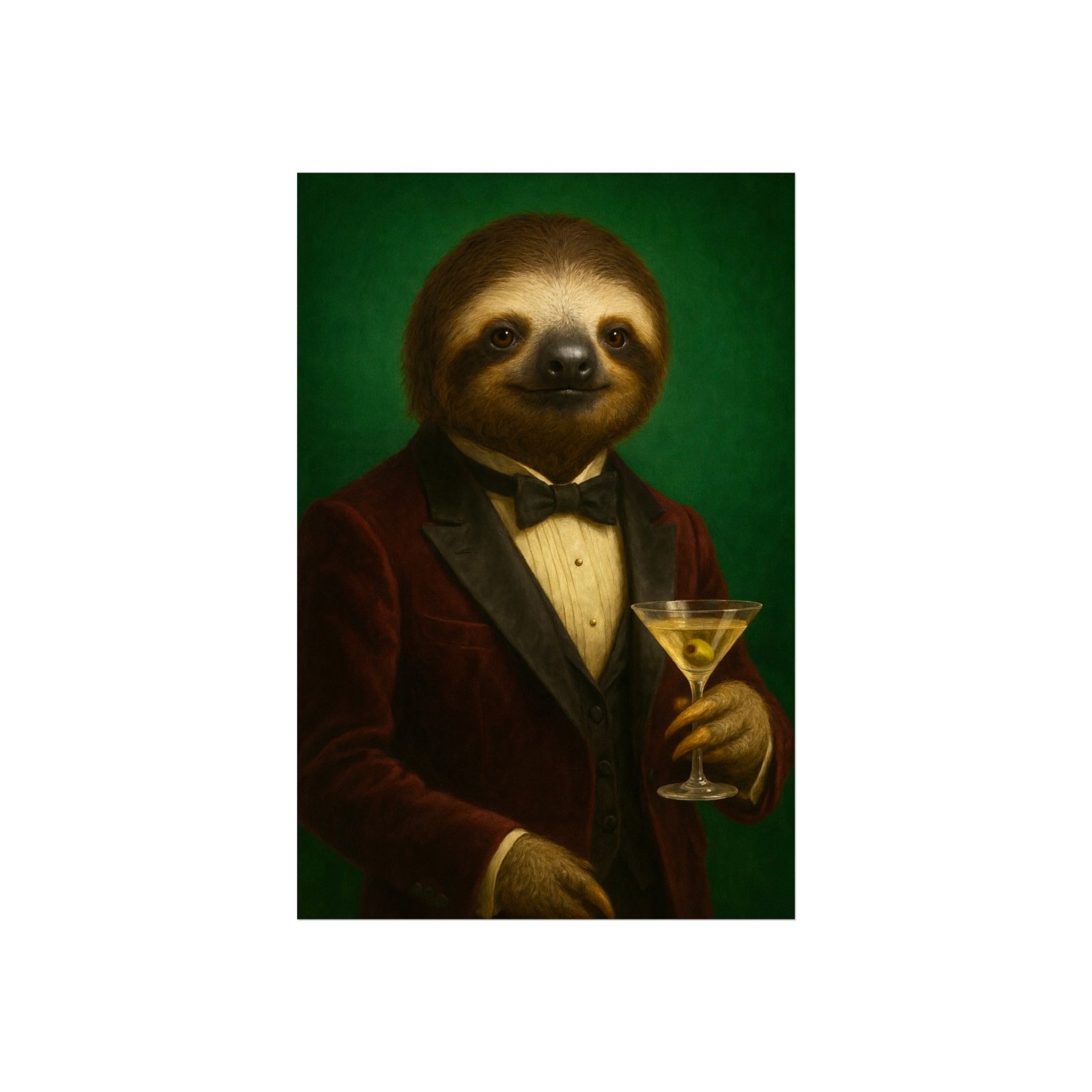 A whimsical fine art poster that brings quiet charm and a wink of sophistication to any room. This giclée-quality print captures a tuxedoed sloth holding a martini against a deep green backdrop — a playful mash of vintage portraiture and modern humor. The smooth matte finish and gallery-grade 220 gsm paper give the image depth and tactile presence, so the character reads beautifully whether framed or mounted. It sits naturally above a sofa, in a study, or tucked into a gallery wall to soften formal spaces and spark conversations. The mood is cozy, slightly decadent, and gently ironic — for people who love art with personality and a touch of mischief.