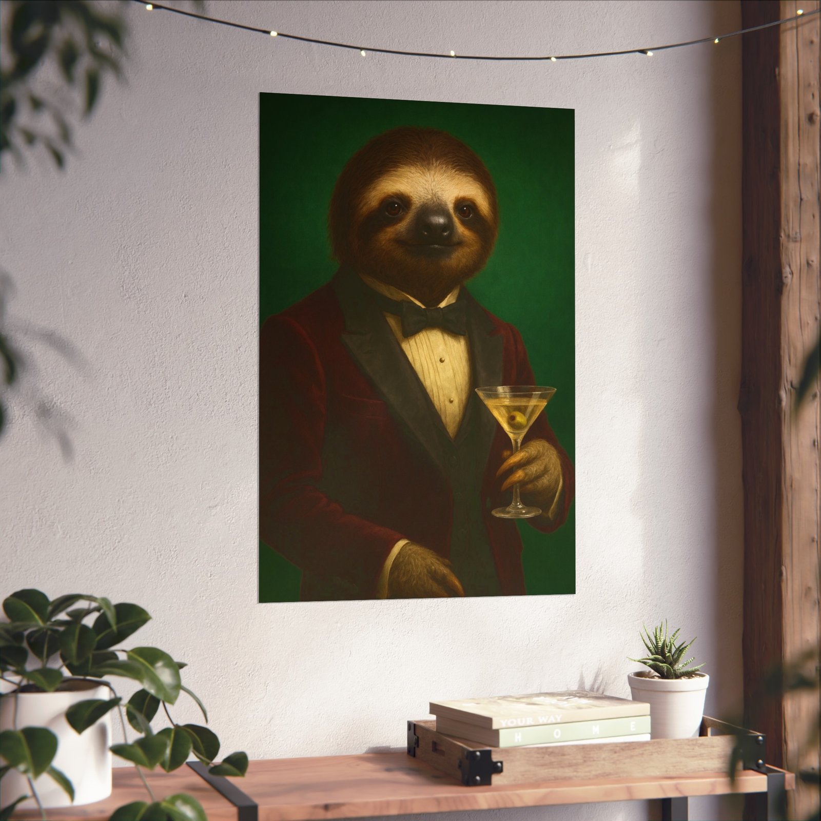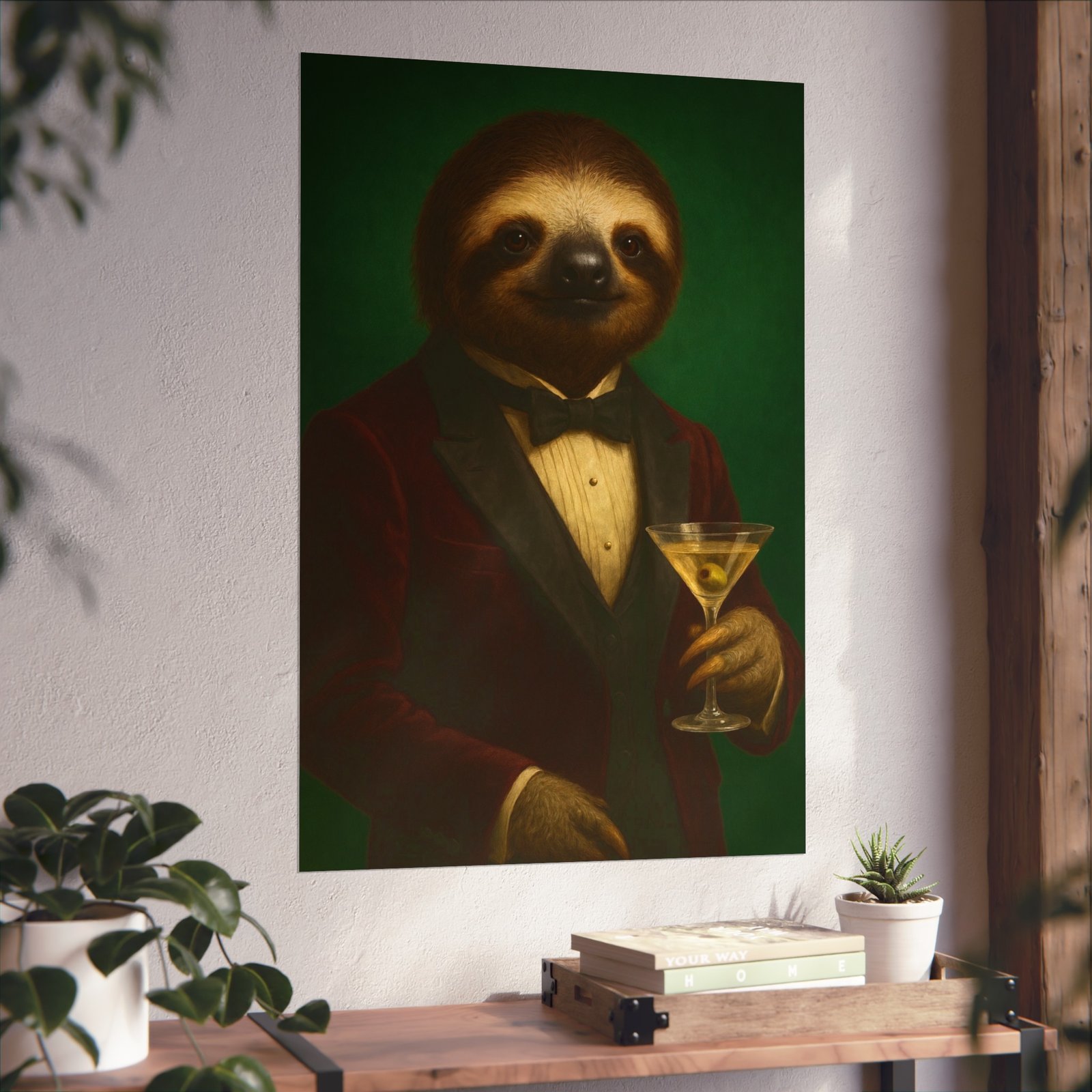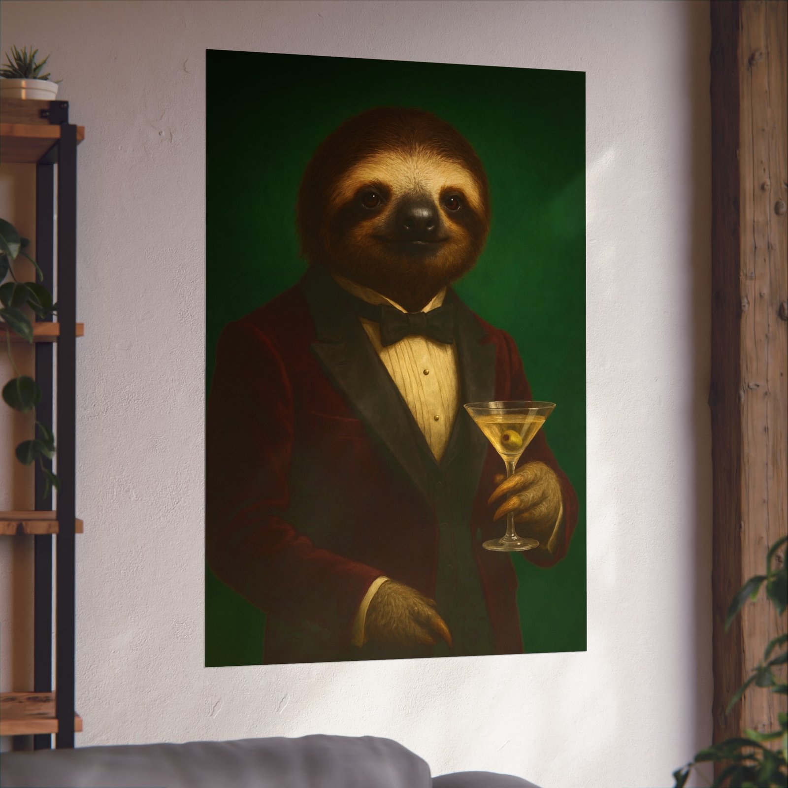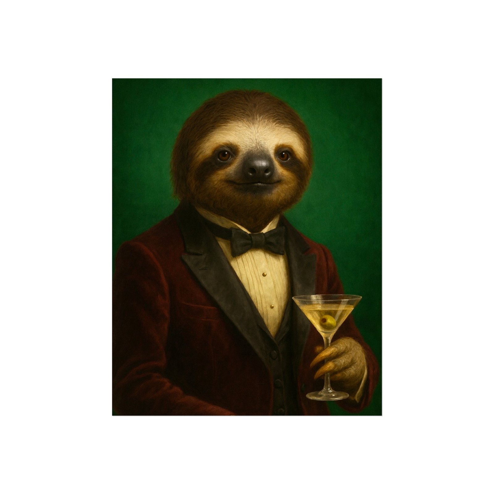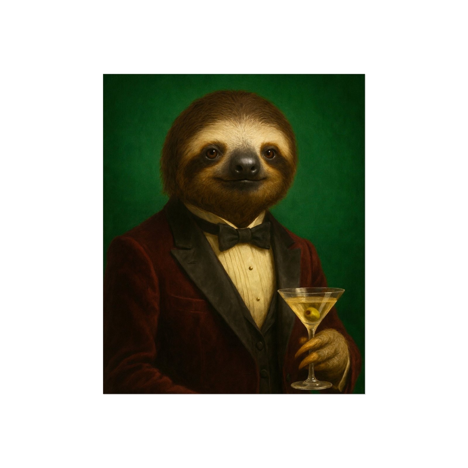 A whimsical fine art poster that brings quiet charm and a wink of sophistication to any room. This giclée-quality print captures a tuxedoed sloth holding a martini against a deep green backdrop — a playful mash of vintage portraiture and modern humor. The smooth matte finish and gallery-grade 220 gsm paper give the image depth and tactile presence, so the character reads beautifully whether framed or mounted. It sits naturally above a sofa, in a study, or tucked into a gallery wall to soften formal spaces and spark conversations. The mood is cozy, slightly decadent, and gently ironic — for people who love art with personality and a touch of mischief.