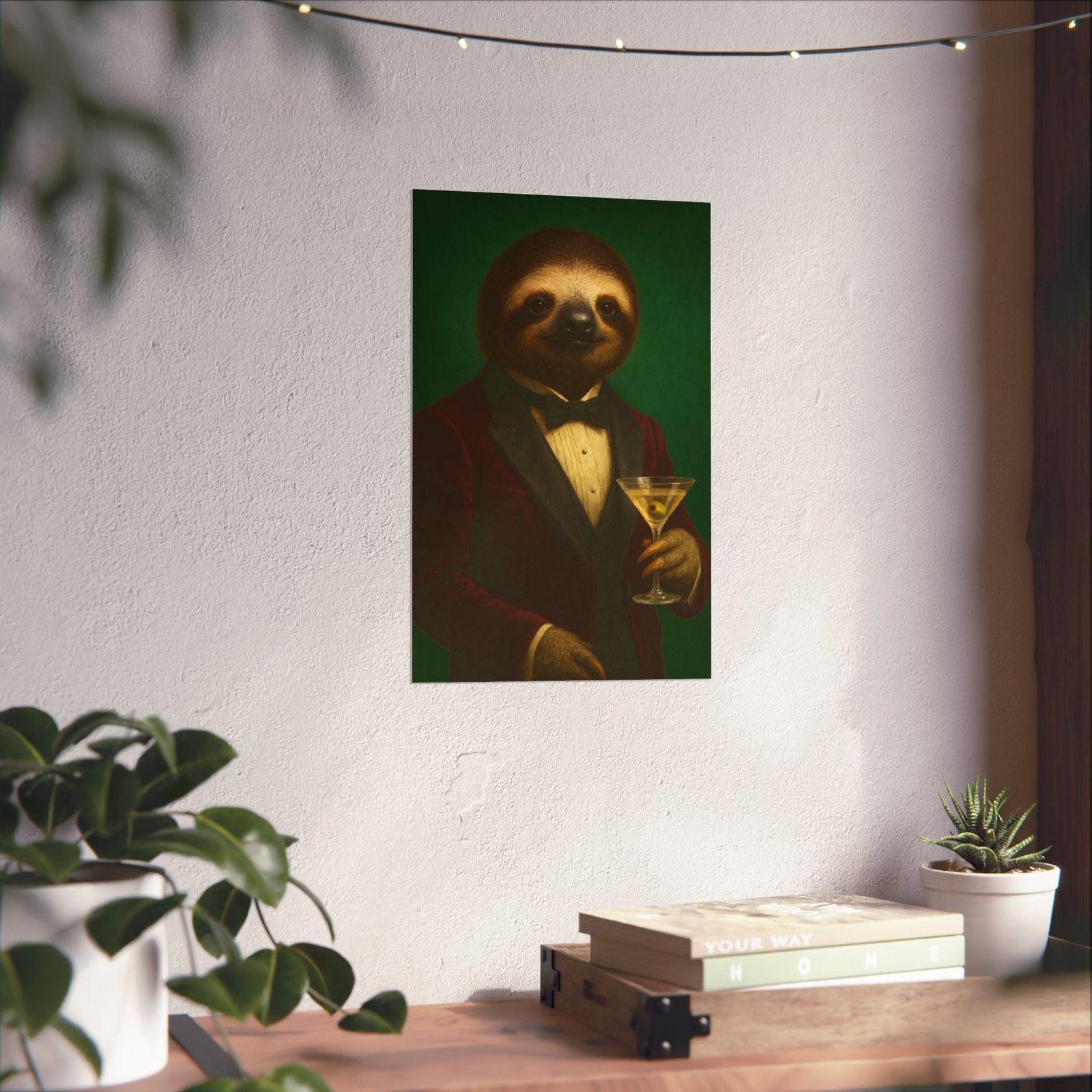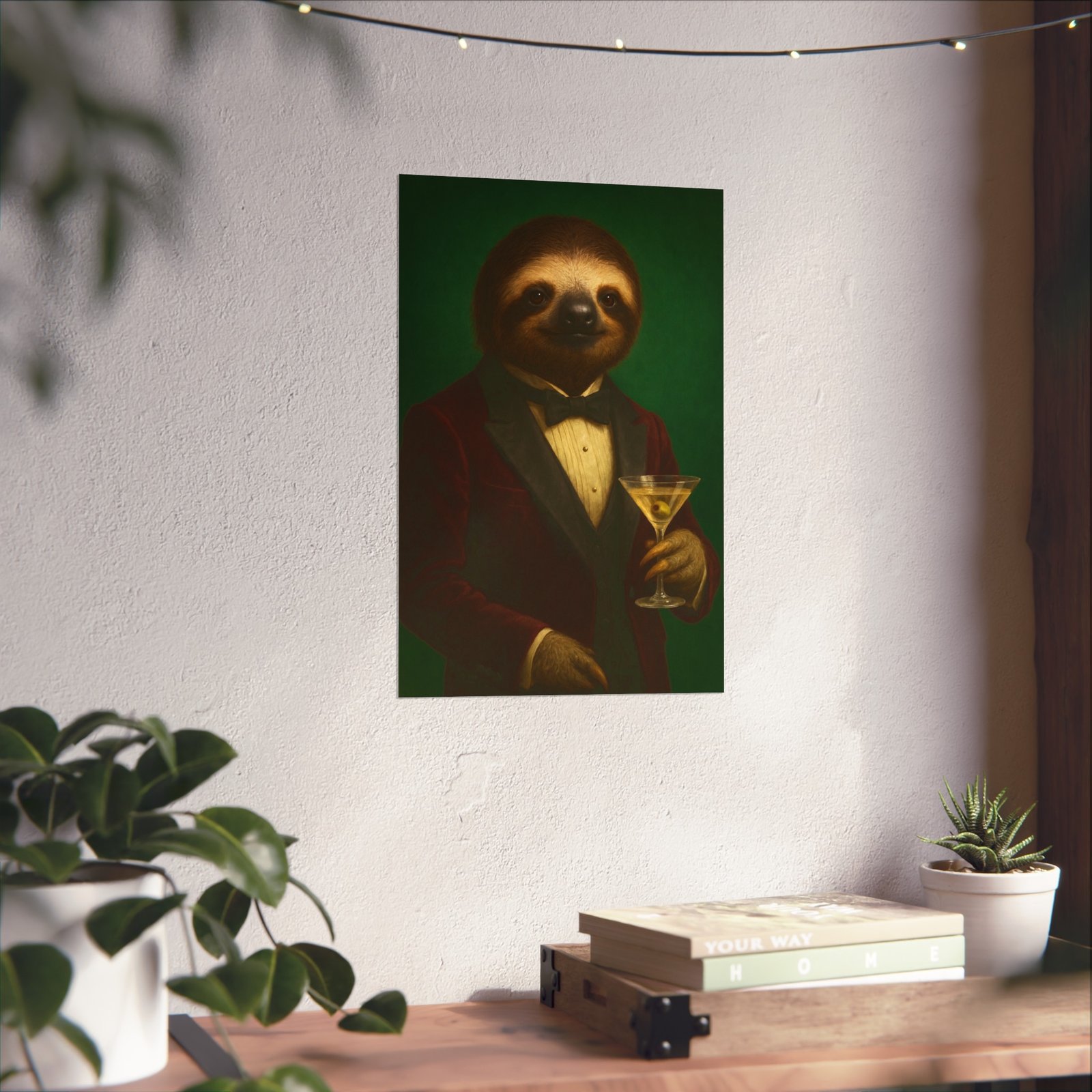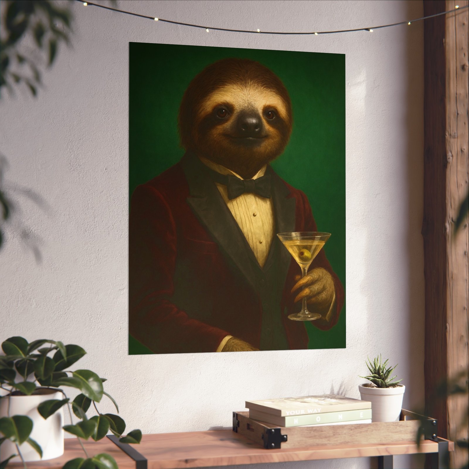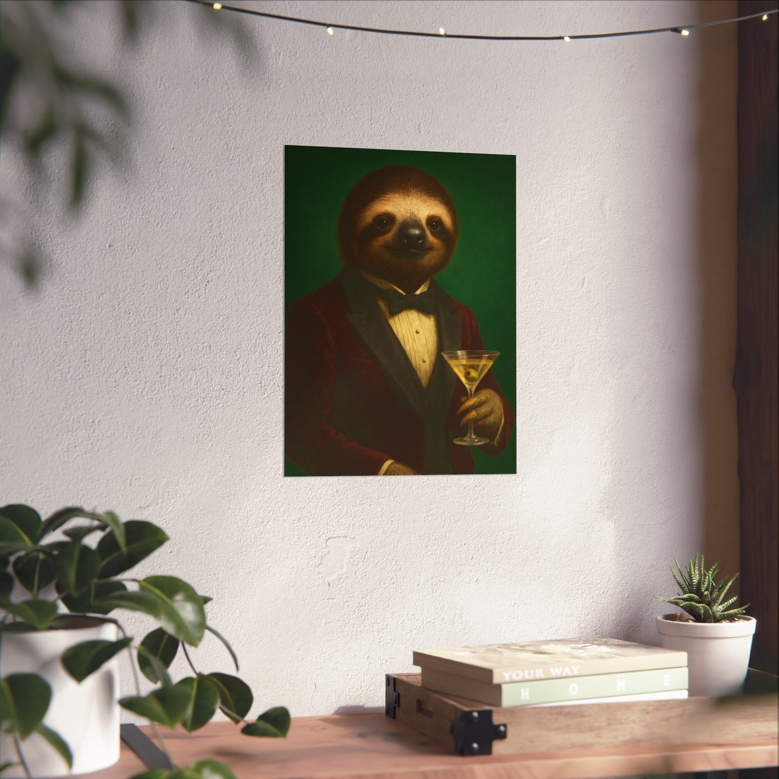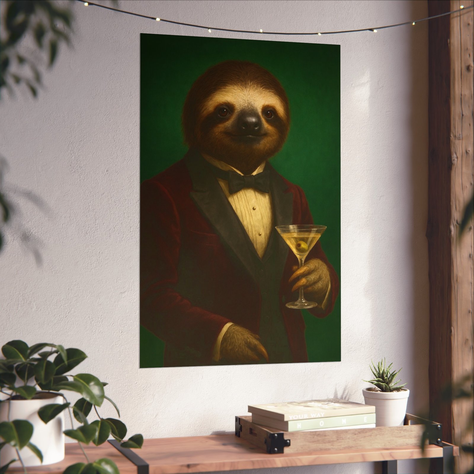 A whimsical fine art poster that brings quiet charm and a wink of sophistication to any room. This giclée-quality print captures a tuxedoed sloth holding a martini against a deep green backdrop — a playful mash of vintage portraiture and modern humor. The smooth matte finish and gallery-grade 220 gsm paper give the image depth and tactile presence, so the character reads beautifully whether framed or mounted. It sits naturally above a sofa, in a study, or tucked into a gallery wall to soften formal spaces and spark conversations. The mood is cozy, slightly decadent, and gently ironic — for people who love art with personality and a touch of mischief.