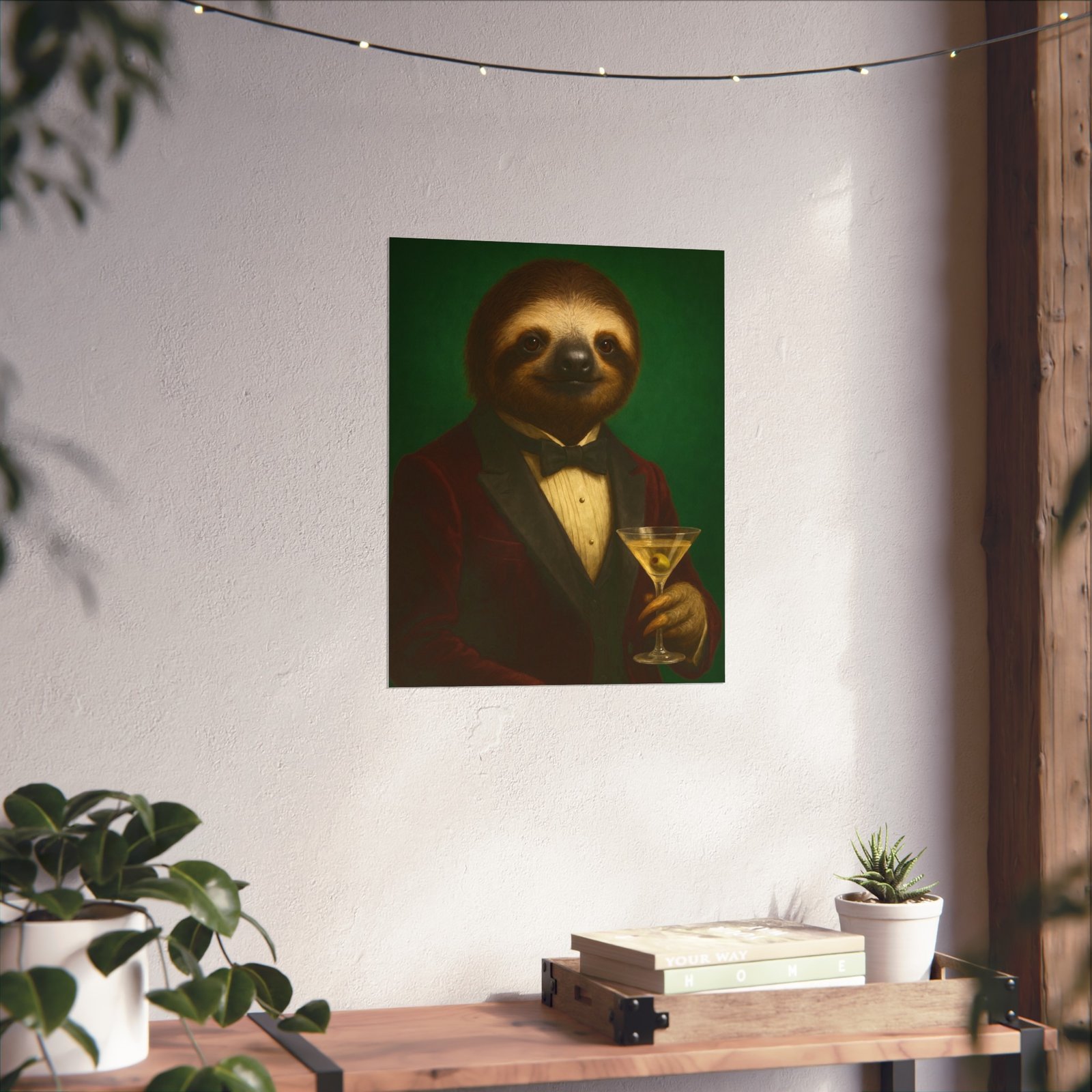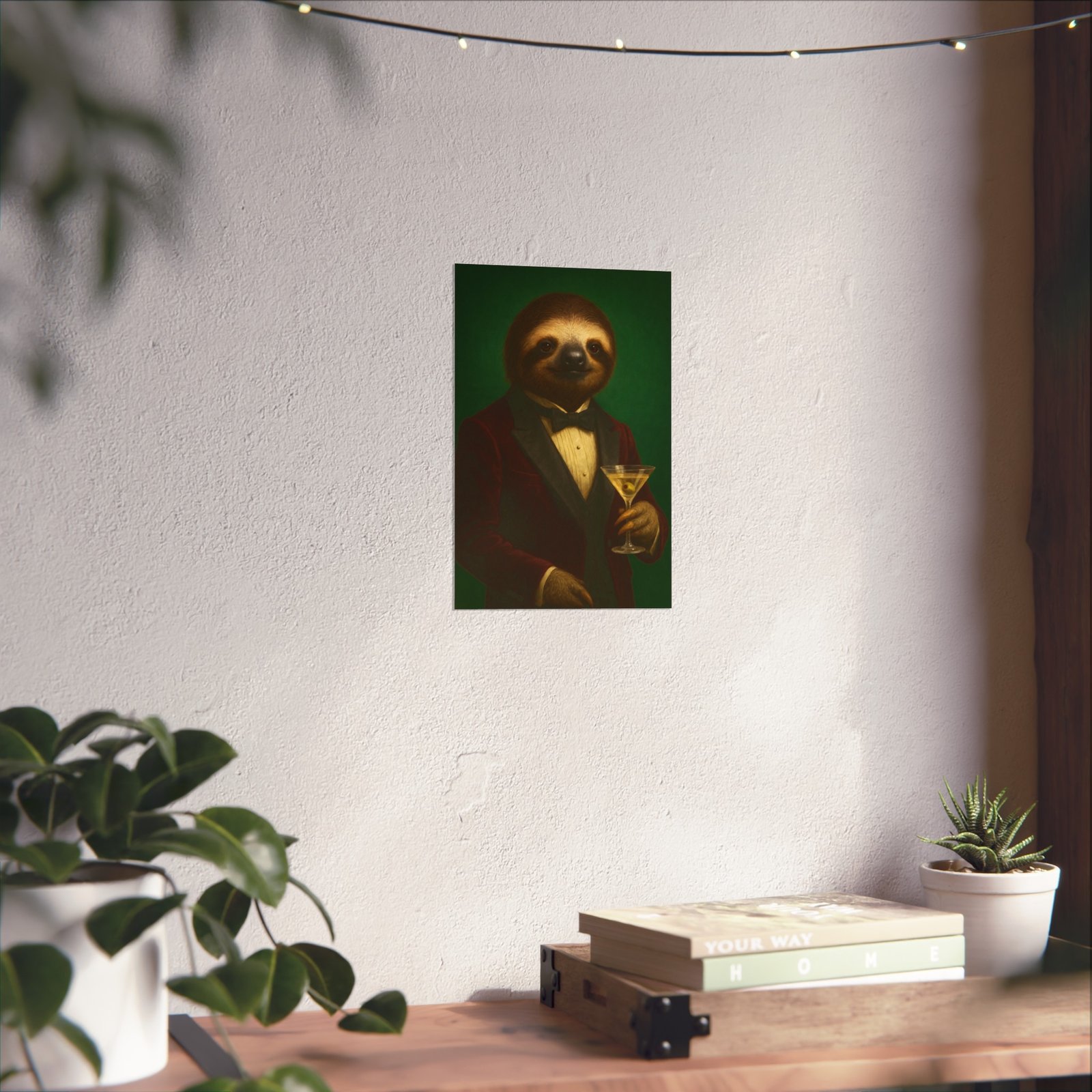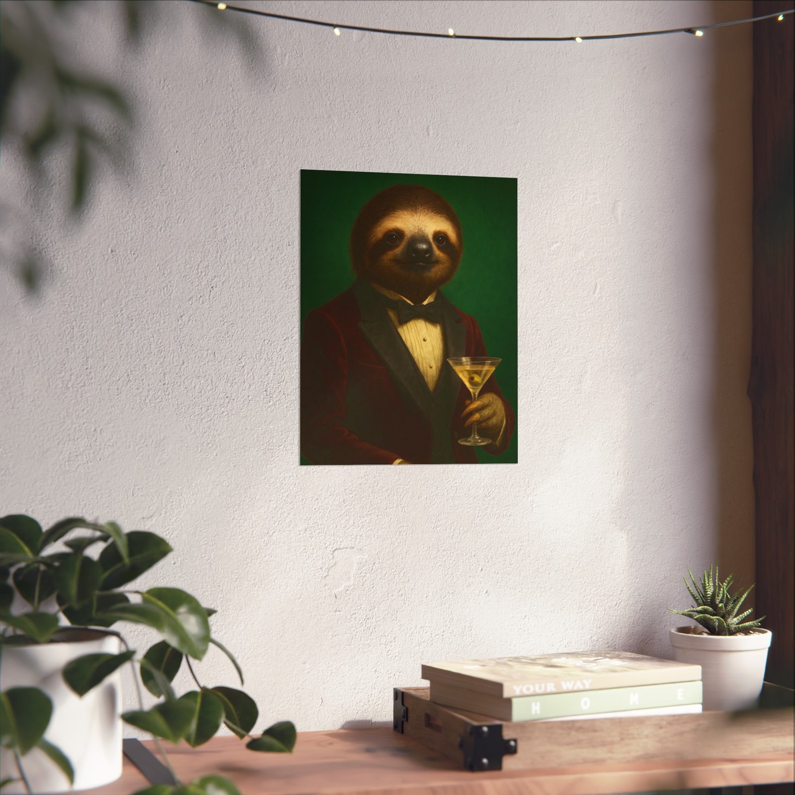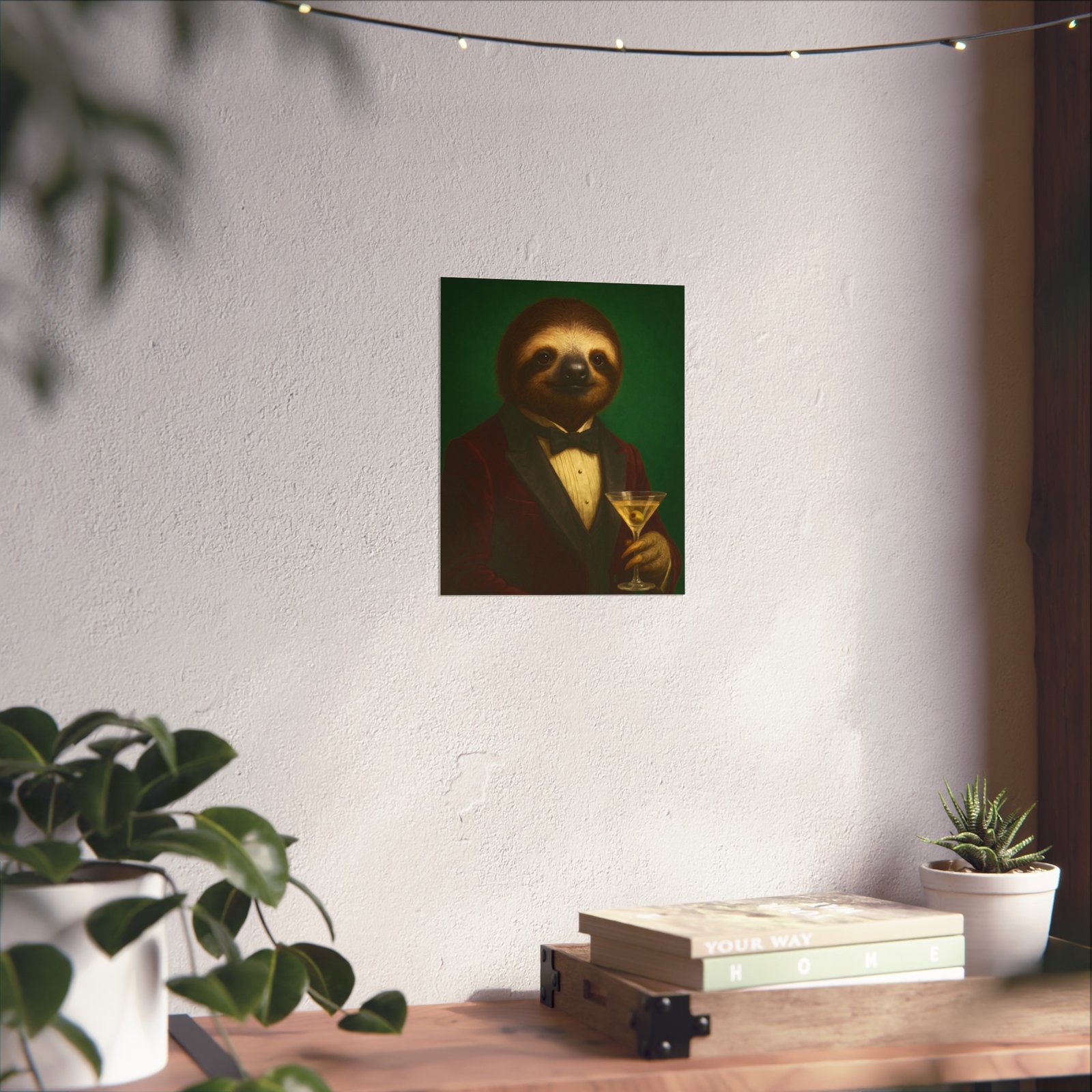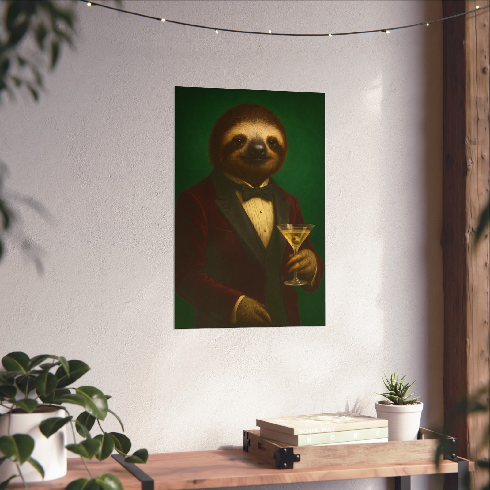A whimsical fine art poster that brings quiet charm and a wink of sophistication to any room. This giclée-quality print captures a tuxedoed sloth holding a martini against a deep green backdrop — a playful mash of vintage portraiture and modern humor. The smooth matte finish and gallery-grade 220 gsm paper give the image depth and tactile presence, so the character reads beautifully whether framed or mounted. It sits naturally above a sofa, in a study, or tucked into a gallery wall to soften formal spaces and spark conversations. The mood is cozy, slightly decadent, and gently ironic — for people who love art with personality and a touch of mischief.